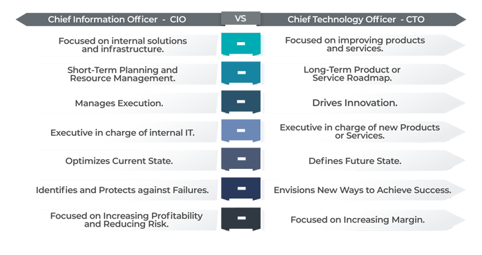 Both the CIO and CTO are business leaders whose primary obective is to provide technology leadership for an organization in concert with other C-level executives. They are responsible for evaluating the current infrastructure and processes and improving those solutions whenever necessary. They must always be on the lookout for new, innovative technologies that can help accomplish the organization’s primary objectives, meet its goals, and reach the desired endpoint.