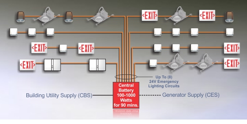 100 or more emergency lighting fixtures and exit signs may be connected to a single central battery panel.